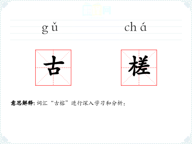 语境分析: 在文学作品中,古榕常被用来营造一种古老、庄重的氛围,如在描述古镇、古村落时常提及古榕作为历史的见证。在口语中,人们可能会用“古榕”来形容某人或某物的古老和稳重。在专业领域,如植物学或生态学中,古榕可能被研究其生长*性、生态价值等。