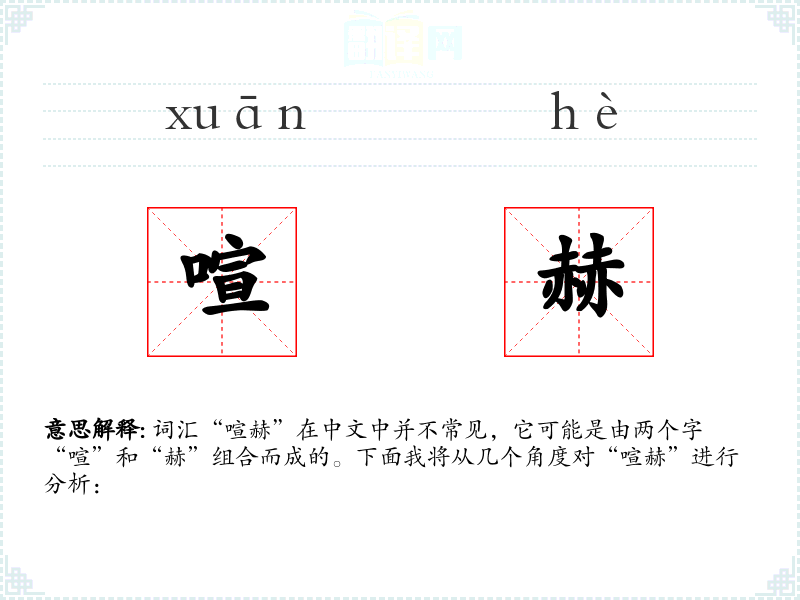 - “喧”和“赫”都是古汉语词汇,组合成“喧赫”可能是现代汉语中的创新用法,用以强调某事物的显著性和影响力。