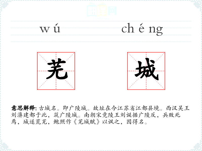古城名。即广陵城。故址在今江苏省江都县境。西汉吴王刘濞建都于此,筑广陵城。南朝宋竟陵王刘诞据广陵反,兵败死焉,城遂荒芜,鲍照作《芜城赋》以讽之,因得名。
