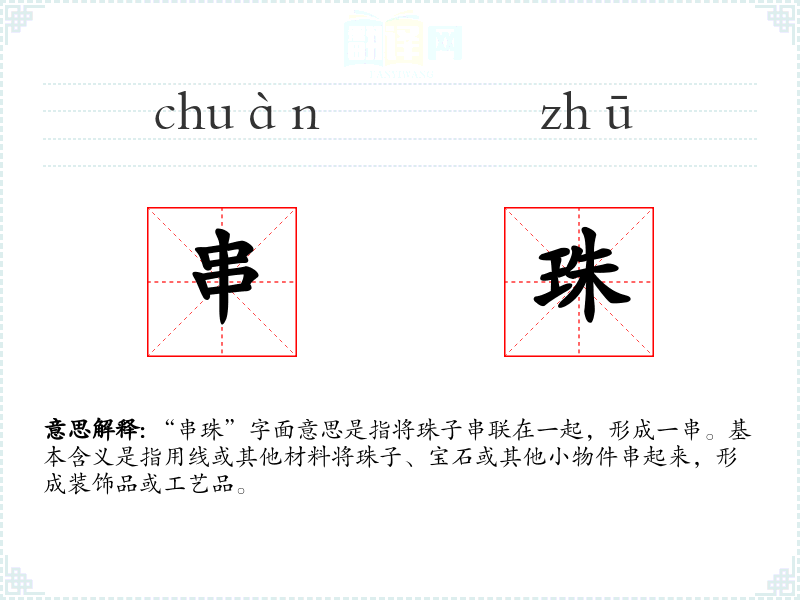 - 口语:在日常对话中,“串珠”通常指具体的珠子串,如“她戴着一串珍珠”。