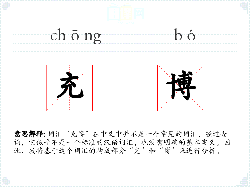 由于“充博”不是一个标准词汇,它在不同语境下的使用可能非常有限。如果它在某个特定领域或方言中被使用,它可能指的是某人知识渊博或某物内容丰富。