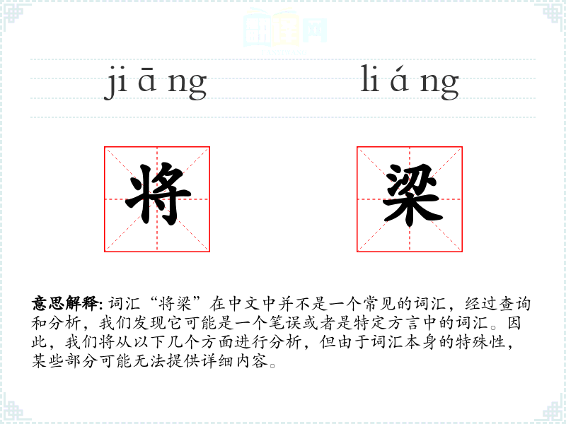 由于“将梁”不是一个标准的中文词汇,我们无法提供确切的基本定义。如果这是一个特定领域的术语或者是方言词汇,可能需要具体的上下文来解释其含义。