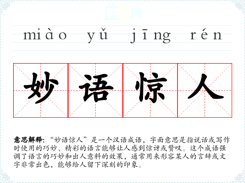 在文化中,语言的艺术一直被高度重视,因此“妙语惊人”这样的成语在文学和日常生活中都有广泛的应用。它反映了人对于智慧和机智的赞赏,以及对于语言表达能力的重视。