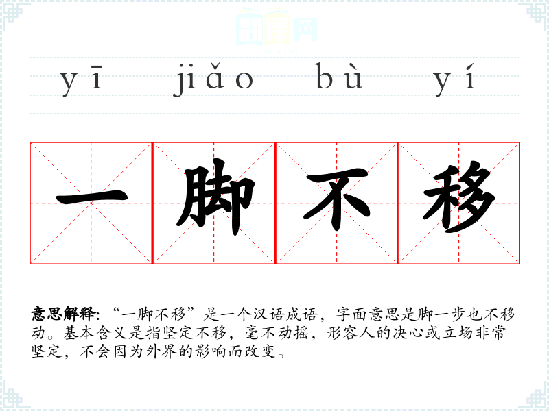 “一脚不移”是一个汉语成语,字面意思是脚一步也不移动。基本含义是指坚定不移,毫不动摇,形容人的决心或立场非常坚定,不会因为外界的影响而改变。