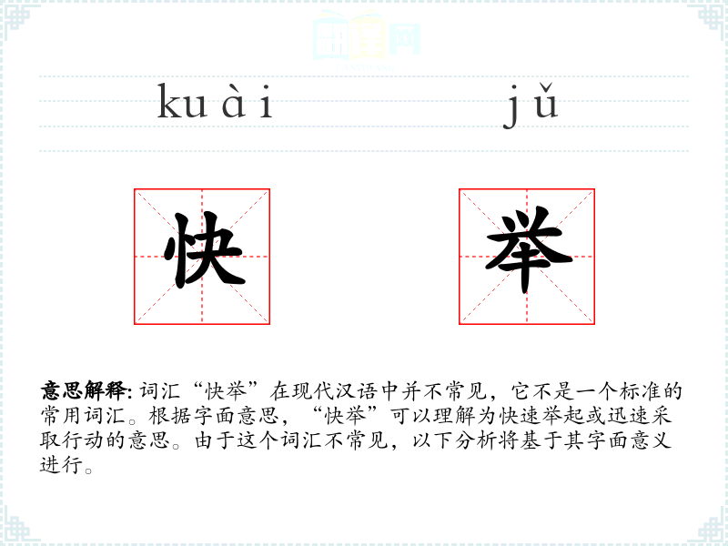 词汇“快举”在现代汉语中并不常见,它不是一个标准的常用词汇。根据字面意思,“快举”可以理解为快速举起或迅速采取行动的意思。由于这个词汇不常见,以下分析将基于其字面意义进行。