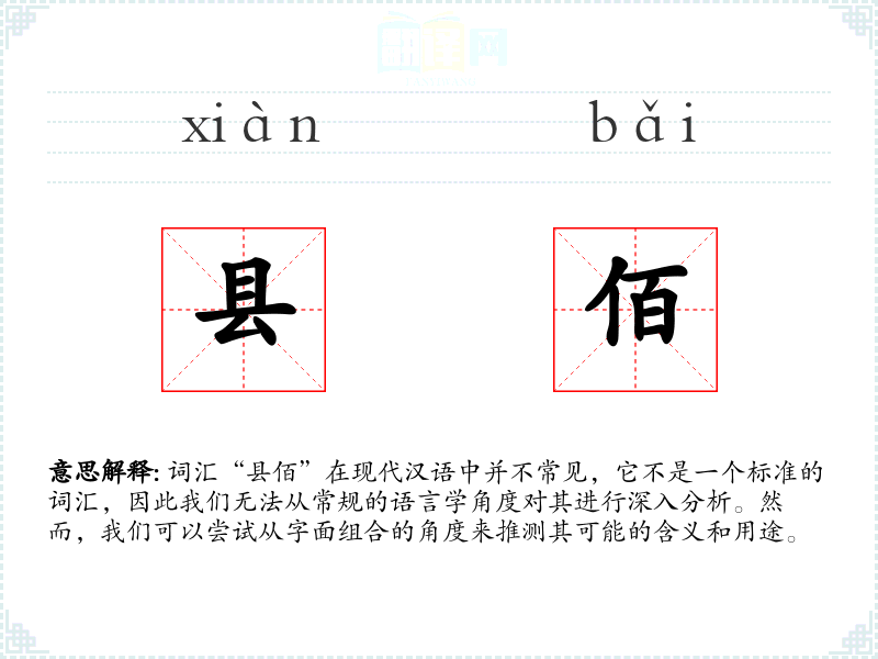 “县佰”这个词汇在现代汉语中并不常见,它不是一个标准词汇,因此我们无法从常规的语言学角度对其进行深入分析。在语言学和表达中,我们应当关注和学那些在语言中广泛使用和认可的标准词汇。