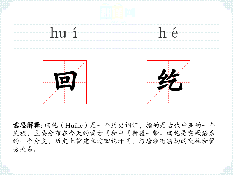 - 同义词:回鹘(Huihu),是回纥的另一种称呼,尤其在历史文献中常见。