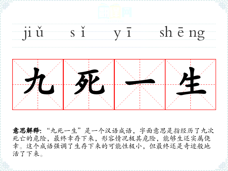 “九死一生”是一个汉语成语,字面意思是指经历了九次死亡的危险,最终幸存下来,形容情况极其危险,能够生还实属侥幸。这个成语强调了生存下来的可能性极小,但最终还是奇迹般地活了下来。