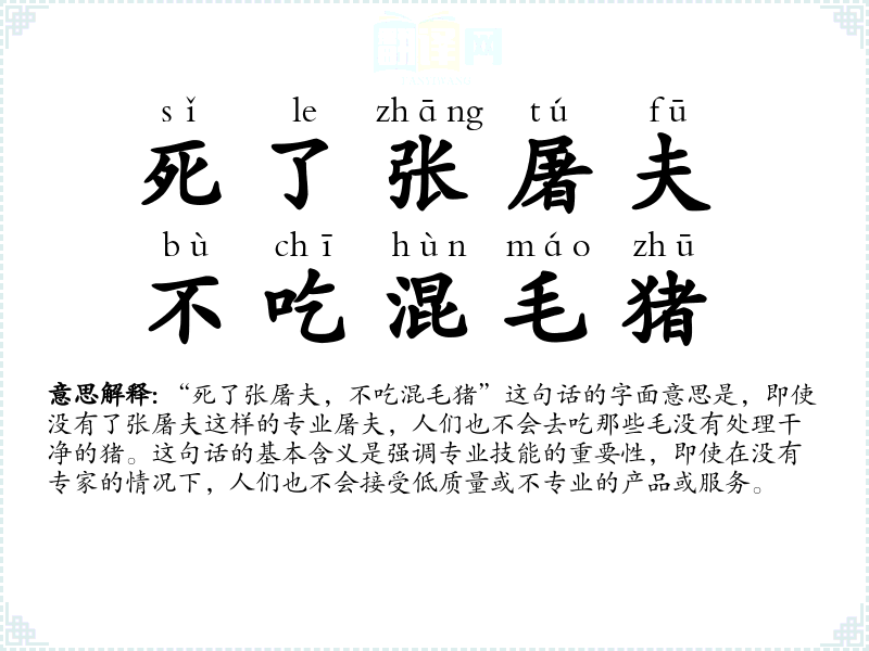 “死了张屠夫,不吃混毛猪”这句话的字面意思是,即使没有了张屠夫这样的专业屠夫,人们也不会去吃那些毛没有处理干净的猪。这句话的基本含义是强调专业技能的重要性,即使在没有专家的情况下,人们也不会接受低质量或不专业的产品或服务。