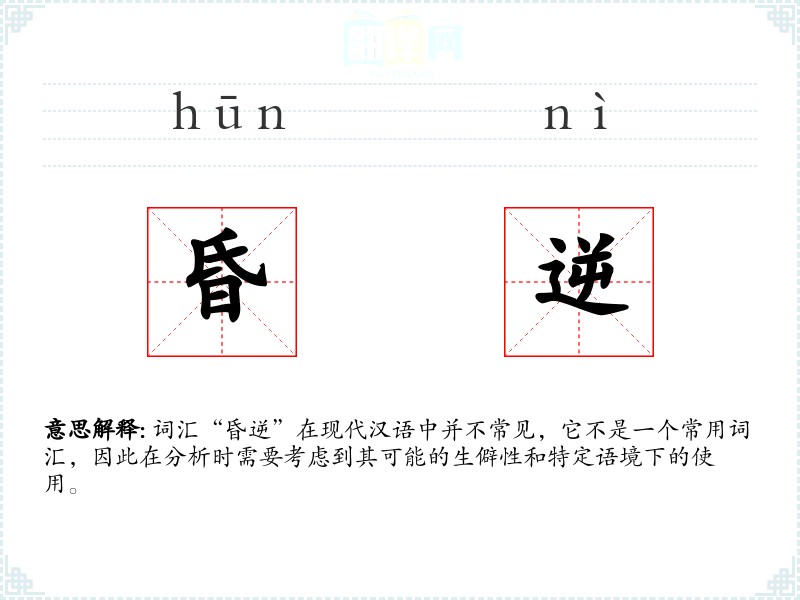 “昏逆”由“昏”和“逆”两个字组成。“昏”原指天色暗淡,引申为不明、糊涂;“逆”指反向、不顺。在古代汉语中,这两个字组合起来形容一种混乱、不顺从的状态。