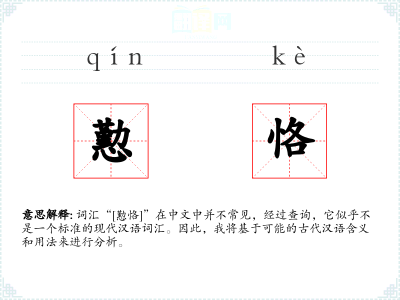 词汇“[懃恪]”在中文中并不常见,经过查询,它似乎不是一个标准的现代汉语词汇。因此,我将基于可能的古代汉语含义和用法来进行分析。