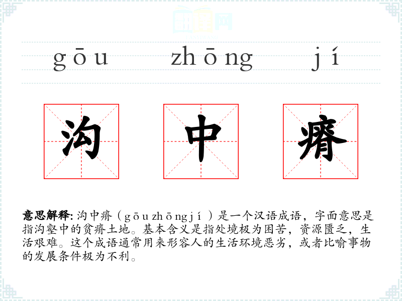 沟中瘠(gōu zhōng jí)是一个汉语成语,字面意思是指沟壑中的贫瘠土地。基本含义是指处境极为困苦,资源匮乏,生活艰难。这个成语通常用来形容人的生活环境恶劣,或者比喻事物的发展条件极为不利。