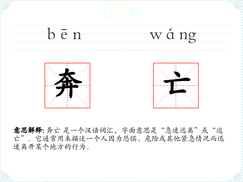 奔亡 是一个汉语词汇,字面意思是“急速逃离”或“逃亡”。它通常用来描述一个人因为恐惧、危险或其他紧急情况而迅速离开某个地方的行为。