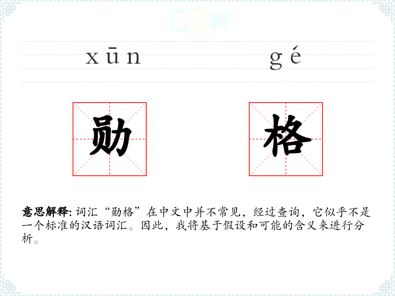 “勋格”可能是由“勋”和“格”两个字组合而成。其中,“勋”通常指功勋、荣誉,而“格”可以指标准、规格或品质。结合起来,“勋格”可能指的是某种荣誉或功勋的标准或规格。