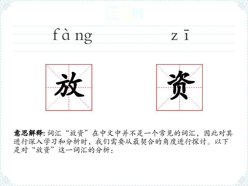 词汇“放资”在中文中并不是一个常见的词汇,因此对其进行深入学习和分析时,我们需要从最契合的角度进行探讨。以下是对“放资”这一词汇的分析: