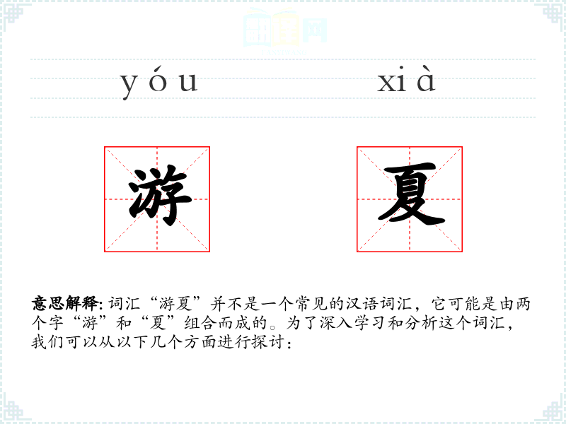 词汇“游夏”并不是一个常见的汉语词汇,它可能是由两个字“游”和“夏”组合而成的。为了深入学习和分析这个词汇,我们可以从以下几个方面进行探讨: