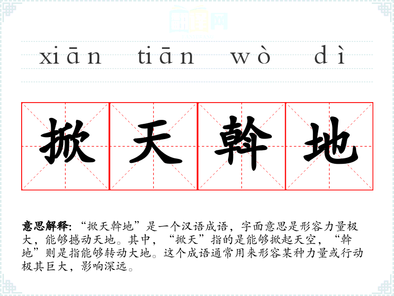 “掀天斡地”是一个汉语成语,字面意思是形容力量极大,能够撼动天地。其中,“掀天”指的是能够掀起天空,“斡地”则是指能够转动大地。这个成语通常用来形容某种力量或行动极其巨大,影响深远。