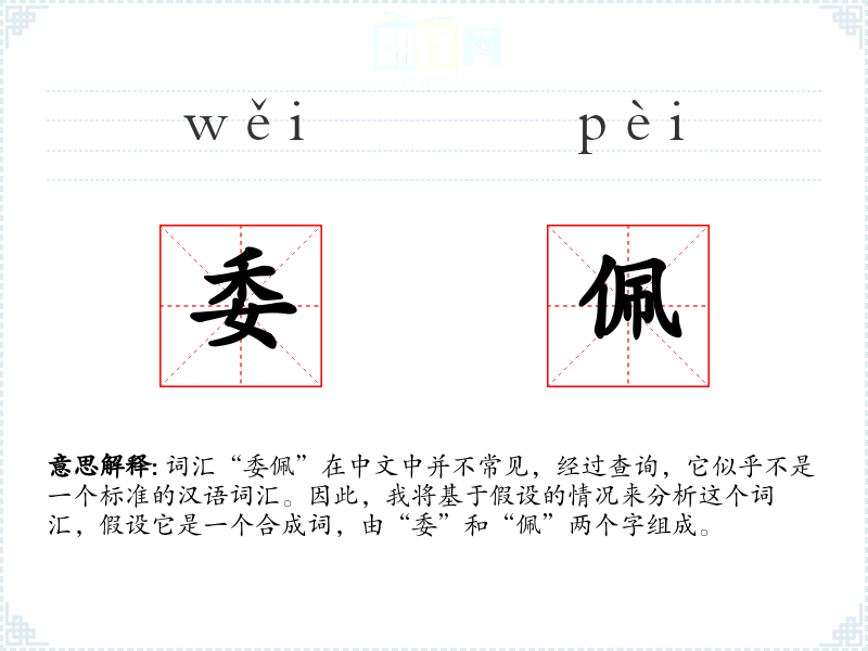 词汇“委佩”在中文中并不常见,经过查询,它似乎不是一个标准的汉语词汇。因此,我将基于假设的情况来分析这个词汇,假设它是一个合成词,由“委”和“佩”两个字组成。