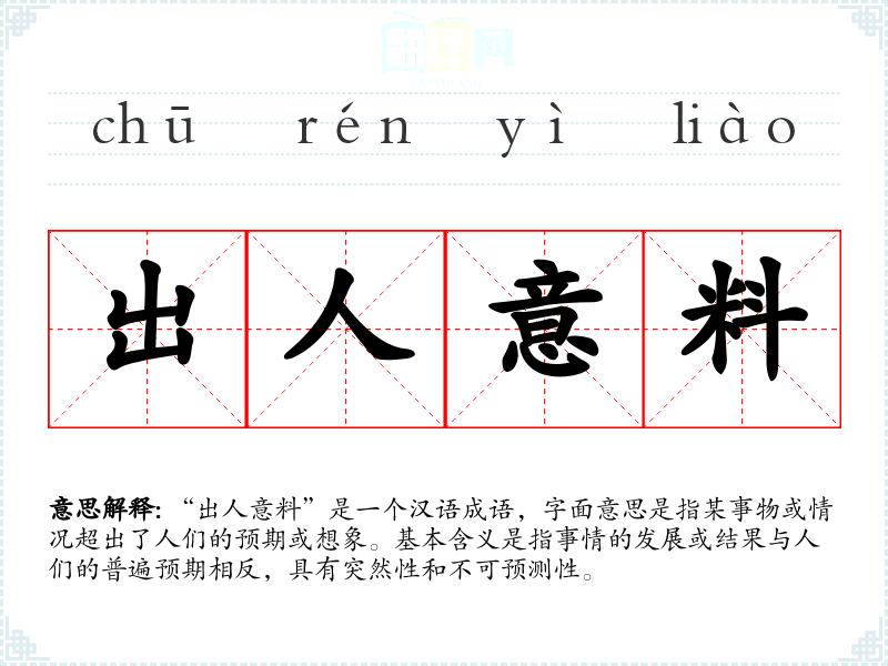 “出人意料”是一个汉语成语,字面意思是指某事物或情况超出了人们的预期或想象。基本含义是指事情的发展或结果与人们的普遍预期相反,具有突然性和不可预测性。