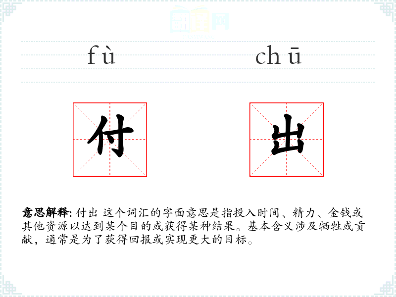 付出 这个词汇的字面意思是指投入时间、精力、金钱或其他资源以达到某个目的或获得某种结果。基本含义涉及牺牲或贡献,通常是为了获得回报或实现更大的目标。