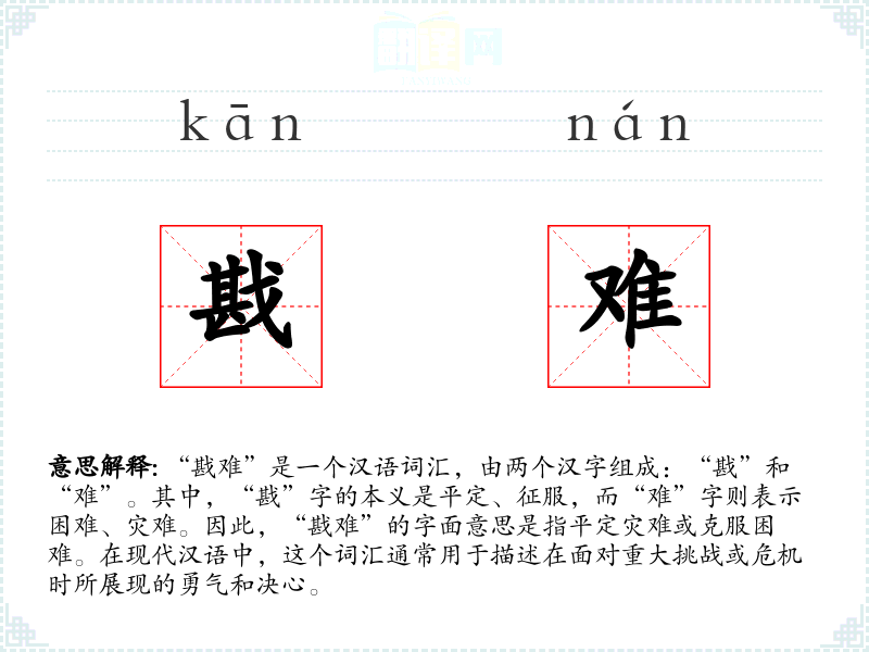 “戡”字最早见于《说文解字》,原意为用斧头砍伐,后来引申为平定、征服。“难”字则源自古代对困难的描述,逐渐演变为表示各种困难和挑战。两个字组合成“戡难”后,其含义主要集中在克服困难和平定灾难上。