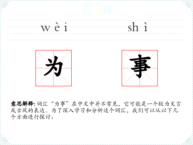词汇“为事”在中文中并不常见,它可能是一个较为文言或古风的表达。为了深入学*和分析这个词汇,我们可以从以下几个方面进行探讨: