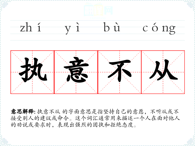 执意不从 的字面意思是指坚持自己的意愿,不听从或不接受别人的建议或命令。这个词汇通常用来描述一个人在面对他人的劝说或要求时,表现出强烈的固执和拒绝态度。