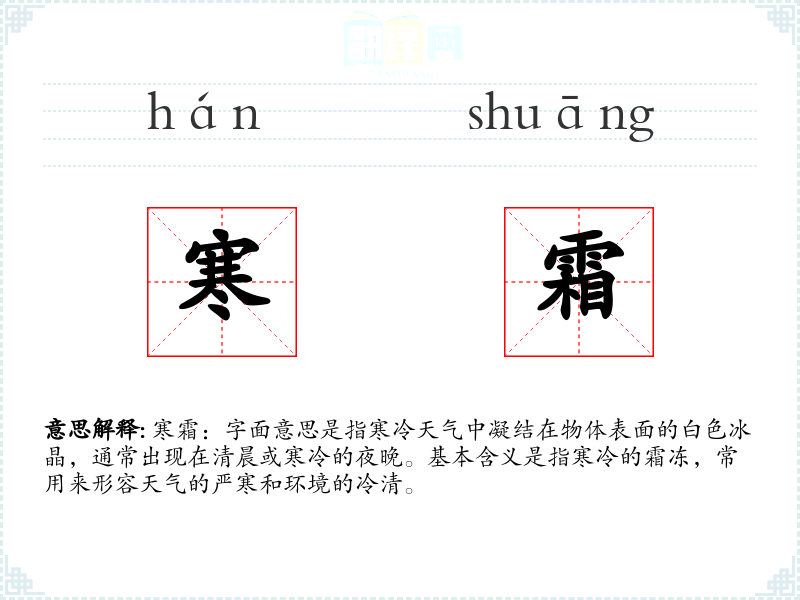 “寒霜”一词由“寒”和“霜”两个字组成。“寒”表示寒冷,“霜”表示凝结的冰晶。在古代汉语中,“霜”常用来形容寒冷的天气,而“寒”则加强了这种寒冷的感觉。随着语言的发展,“寒霜”逐渐成为描述寒冷天气的常用词汇。