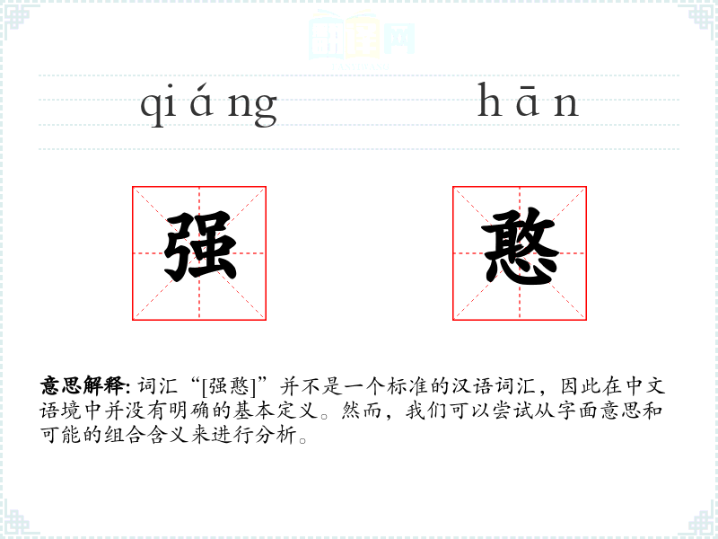 词汇“[强憨]”并不是一个标准的汉语词汇,因此在中文语境中并没有明确的基本定义。然而,我们可以尝试从字面意思和可能的组合含义来进行分析。