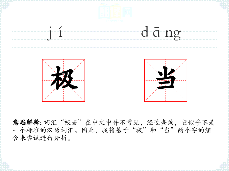 词汇“极当”在中文中并不常见,经过查询,它似乎不是一个标准的汉语词汇。因此,我将基于“极”和“当”两个字的组合来尝试进行分析。