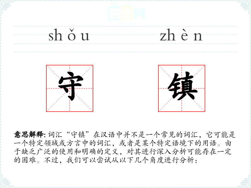 由于“守镇”不是一个标准词汇,我们无法给出一个确切的字面意思和基本含义。它可能是指“守护城镇”的意思,或者是某个特定地区或文化中的特定概念。