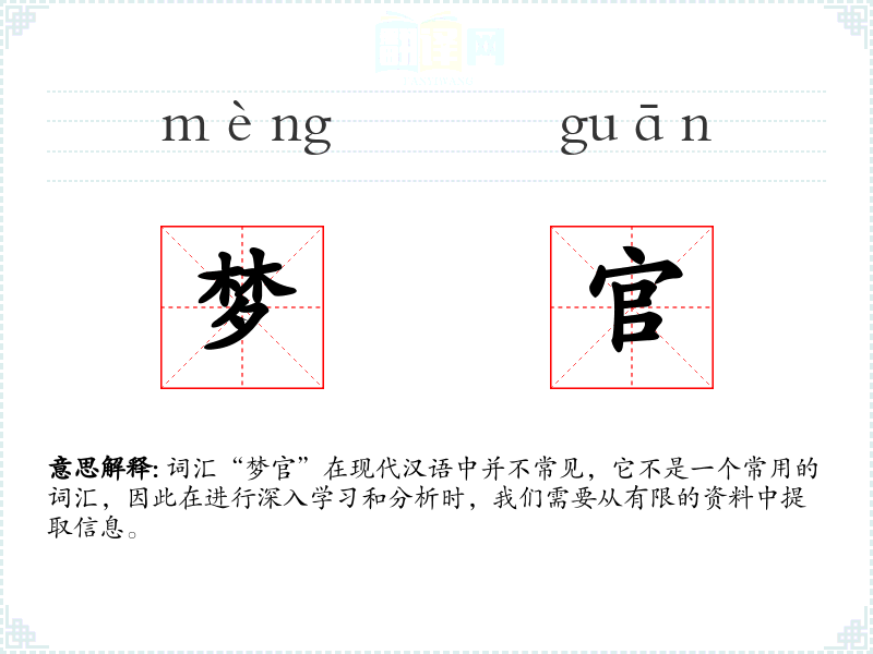词汇“梦官”在现代汉语中并不常见,它不是一个常用的词汇,因此在进行深入学*和分析时,我们需要从有限的资料中提取信息。
