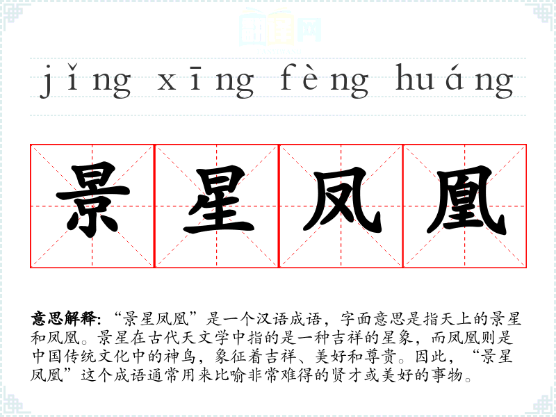 在传统文化中,景星和凤凰都是吉祥的象征,因此“景星凤凰”这个成语在社会中有着积极的含义。它不仅用来赞美那些有才华和品德的人,也用来形容那些美好的事物或现象。