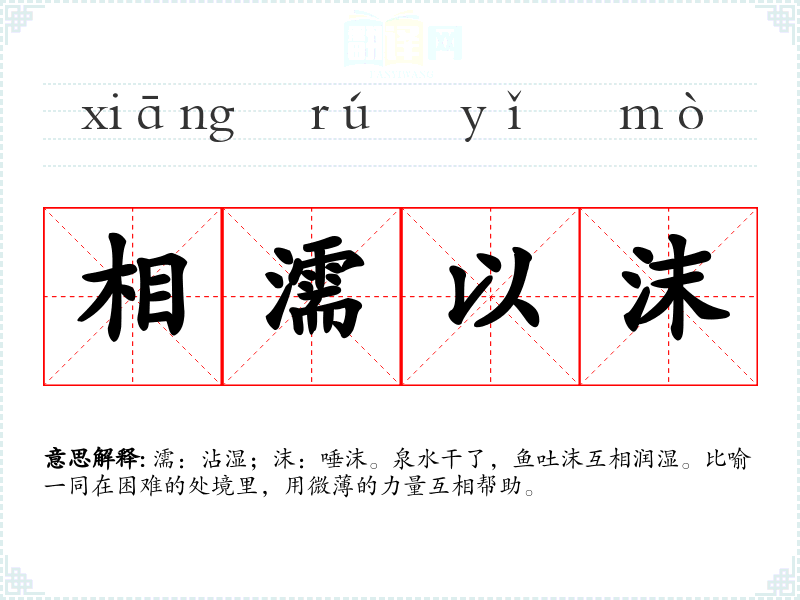 濡:沾湿;沫:唾沫。泉水干了,鱼吐沫互相润湿。比喻一同在困难的处境里,用微薄的力量互相帮助。