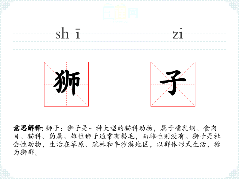 "狮子"的意思解释、狮子是什么意思由翻译网汉语词典查词提供。