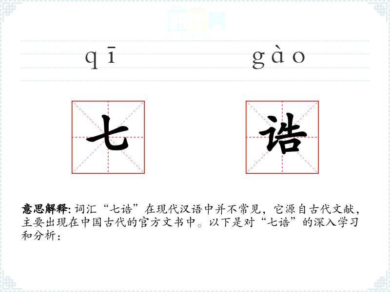 词汇“七诰”在现代汉语中并不常见,它源自古代文献,主要出现在*古代的官方文书中。以下是对“七诰”的深入学和分析: