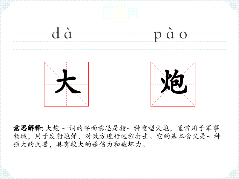 大炮 一词的字面意思是指一种重型火炮,通常用于军事领域,用于发射炮弹,对敌方进行远程打击。它的基本含义是一种强大的武器,具有较大的杀伤力和破坏力。