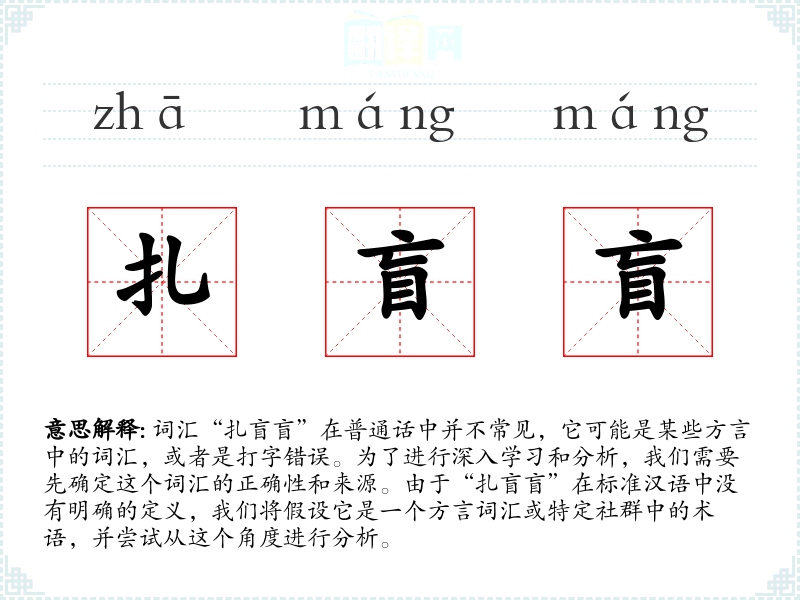 词汇“扎盲盲”在普通话中并不常见,它可能是某些方言中的词汇,或者是打字错误。为了进行深入学习和分析,我们需要先确定这个词汇的正确性和来源。由于“扎盲盲”在标准汉语中没有明确的定义,我们将假设它是一个方言词汇或特定社群中的术语,并尝试从这个角度进行分析。