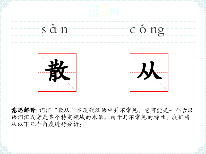 词汇“散从”在现代汉语中并不常见,它可能是一个古汉语词汇或者是某个特定领域的术语。由于其不常见的特性,我们将从以下几个角度进行分析: