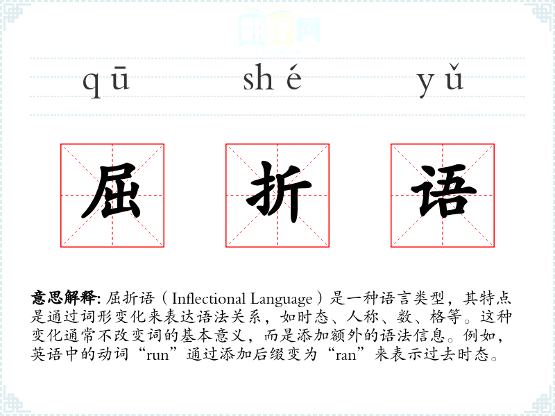屈折语(Inflectional Language)是一种语言类型,其特点是通过词形变化来表达语法关系,如时态、人称、数、格等。这种变化通常不改变词的基本意义,而是添加额外的语法信息。例如,英语中的动词“run”通过添加后缀变为“ran”来表示过去时态。
