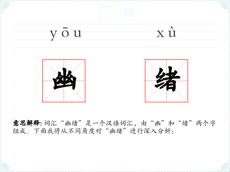 词汇“幽绪”是一个汉语词汇,由“幽”和“绪”两个字组成。下面我将从不同角度对“幽绪”进行深入分析: