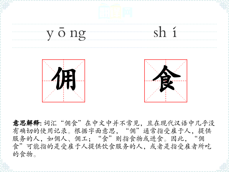 词汇“佣食”在中文中并不常见,且在现代汉语中几乎没有确切的使用记录。根据字面意思,“佣”通常指受雇于人,提供服务的人,如佣人、佣工;“食”则指食物或进食。因此,“佣食”可能指的是受雇于人提供饮食服务的人,或者是指受雇者所吃的食物。