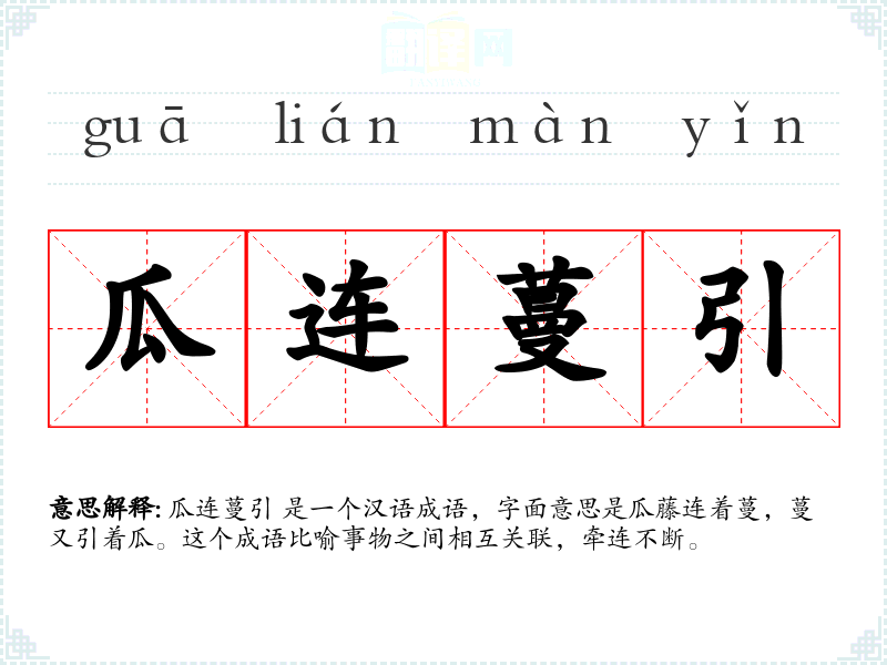 瓜连蔓引 是一个汉语成语,字面意思是瓜藤连着蔓,蔓又引着瓜。这个成语比喻事物之间相互关联,牵连不断。