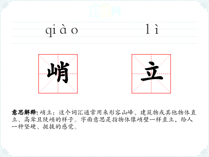 峭立:这个词汇通常用来形容山峰、建筑物或其他物体直立、高耸且陡峭的样子。字面意思是指物体像峭壁一样直立,给人一种坚硬、挺拔的感觉。