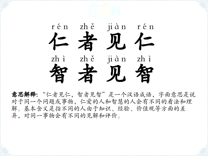 “仁者见仁,智者见智”是一个汉语成语,字面意思是说对于同一个问题或事物,仁爱的人和智慧的人会有不同的看法和理解。基本含义是指不同的人由于知识、经验、价值观等方面的差异,对同一事物会有不同的见解和评价。