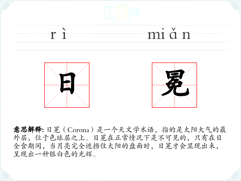 - 同义词:日冕的同义词可能包括“太阳冕”或“日冕层”,但这些词汇的使用频率较低。