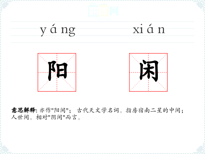 亦作"阳间"; 古代天文学名词。指房宿南二星的中间; 人世间。相对"阴间"而言。