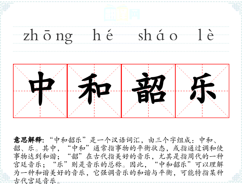 “中和韶乐”中的“中和”源自《中庸》,强调中正平和;“韶”源自周代的宫廷音乐“韶乐”,据说是由舜帝时期的乐官夔创作的;“乐”则是音乐的通用词汇。这个词汇在古代文献中有所记载,但在现代汉语中使用频率较低,主要在学术讨论或文化传承中出现。