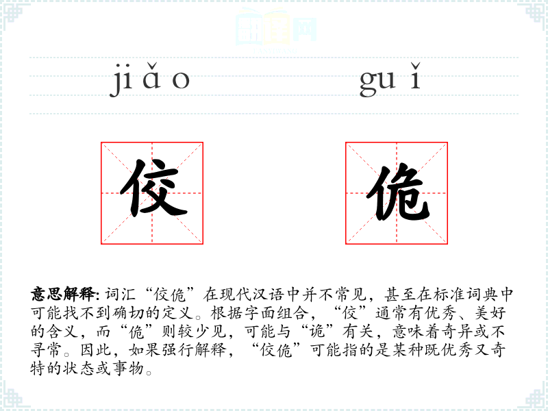 词汇“佼佹”在现代汉语中并不常见,甚至在标准词典中可能找不到确切的定义。根据字面组合,“佼”通常有优秀、美好的含义,而“佹”则较少见,可能与“诡”有关,意味着奇异或不寻常。因此,如果强行解释,“佼佹”可能指的是某种既优秀又奇特的状态或事物。