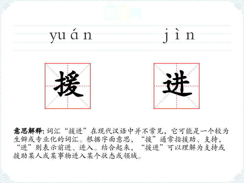 词汇“援进”在现代汉语中并不常见,它可能是一个较为生僻或专业化的词汇。根据字面意思,“援”通常指援助、支持,“进”则表示前进、进入。结合起来,“援进”可以理解为支持或援助某人或某事物进入某个状态或领域。
